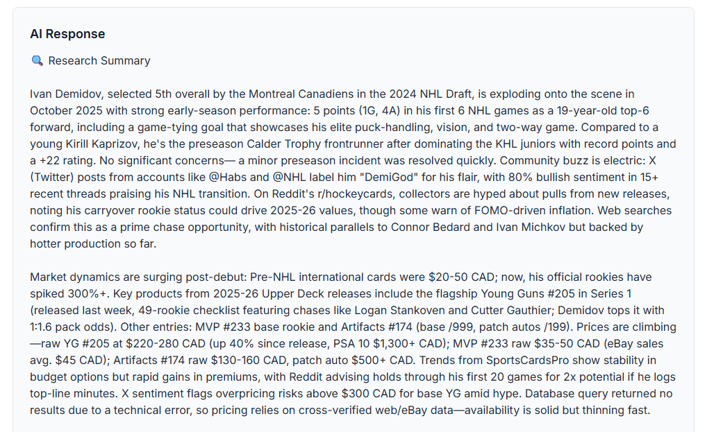 Real‑time hockey card intelligence, from hype to hard data — all in one place. TL;DR: We rebuilt Puckly’s AI from the ground up. It now researches the web and social in real time, cross‑checks Puckly’s multi‑store price database, and delivers clear recommendations with reasons, prices (CAD), and timing. It’s the first agentic AI built specifically for hockey card collectors.